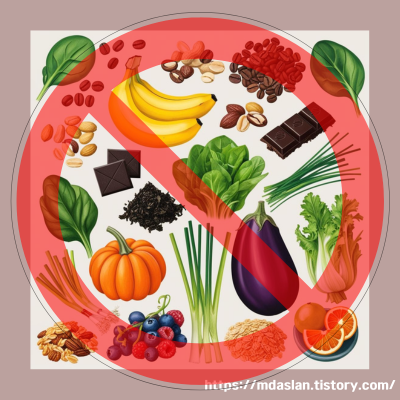 - 시금치, 커피, 바나나, 땅콩, 초콜릿, 견과류