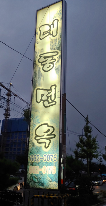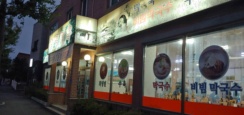 영업 시간을(오후 8시까지) 확인하고 기대감에 막국수 원정대를 소집했고, 퇴근과 동시에 차를 몰아 주문진에 도착했다. 날이 싸늘해지고, 해는 짧아졌던 터라 주변은 이미 어둑하게 저녁이 내리앉은 상태였다. 환하게 불이 켜진 낡은 간판을 따라 주차장에 주차를 하고 식당으로 이동했다.